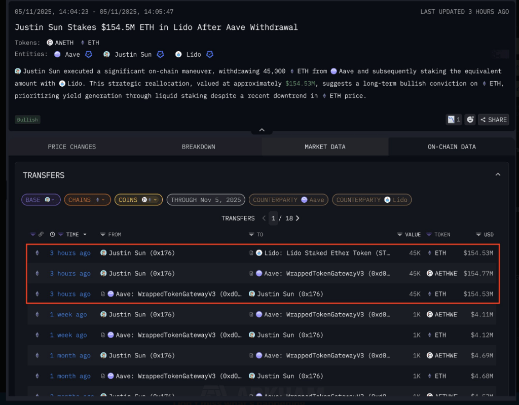 According to on-chain data, about 45,000 ETH — worth roughly $154.5 million at the time — was shifted from the lending protocol Aave into the Lido Finance staking pool.