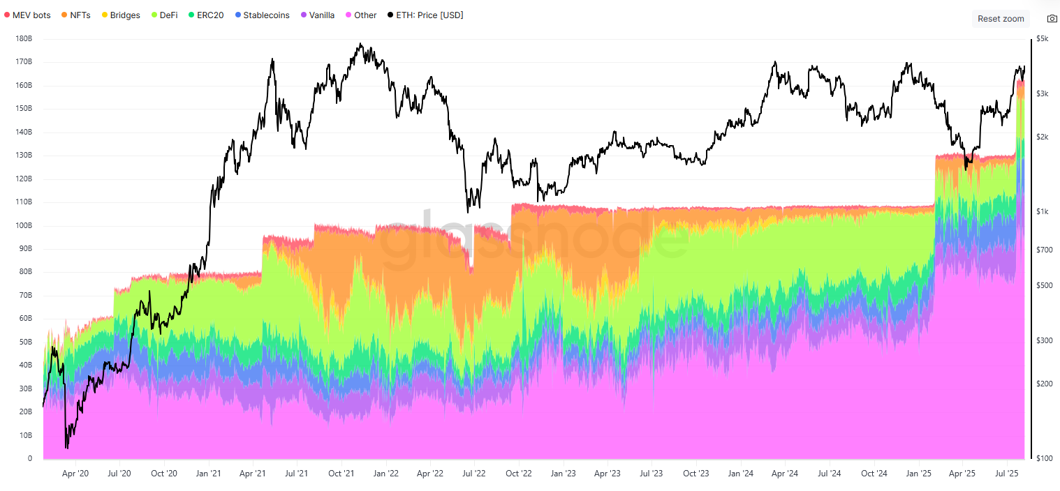 Glassnode data reveals that DeFi, despite being Ethereum’s key sector, now accounts for just 11% of its gas consumption. NFTs, which used a sizeable share of gas back in 2022, have now fallen to 4%. The “Other” category, however, has surged from about 25% in 2022 to over 58% today. This category covers emerging areas such as real-world asset tokenization (RWA), decentralized physical infrastructure (DePIN), AI-based DApps, and other more or less novel services that may define Web3’s next growth phase.