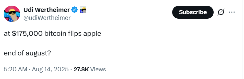 Bitcoin would need to rise above $175,000 to flip Apple’s current $3.4 trillion market capitalization, which may occur before the end of August, said crypto analyst and Taproot developer Udi Wertheimer in a Thursday X post.