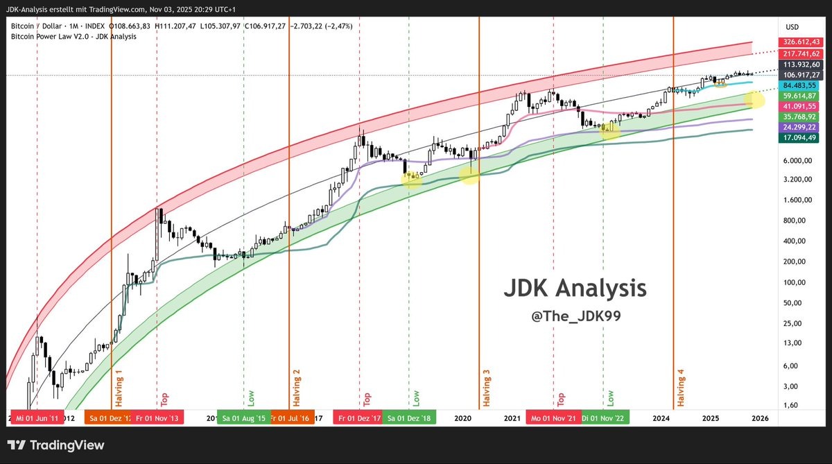 Using the power law model, technical analyst JDK Analysis asked veteran trader Peter Brandt to weigh in on how low Bitcoin price could go.