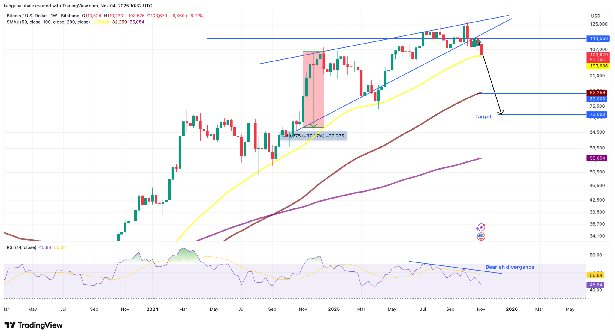 A weekly close below this area will clear that path for BTC’s drop toward the wedge’s target at $72,000, representing a 30% decline from the current price.