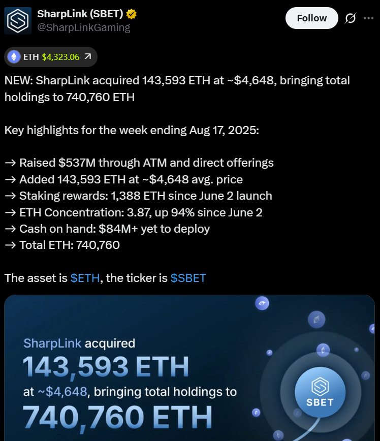 Even with the massive haul, SharpLink is not the largest Ether treasury holder. That title belongs to BitMine, which acquired 373,000 ETH on Monday, lifting its total holdings to 1.52 million ETH, valued at about $6.5 billion.