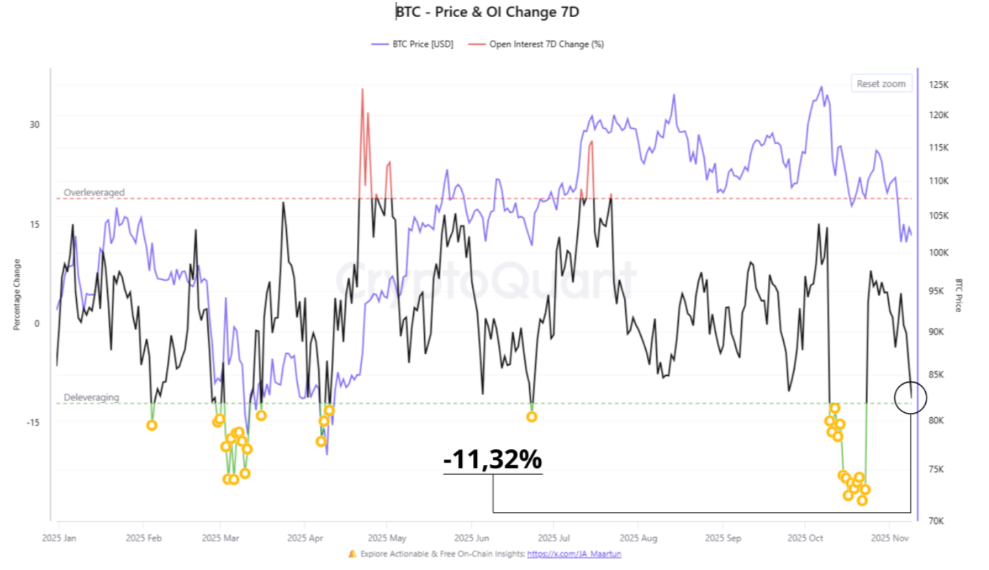 “The 11.32% drop in OI over 7 days is a sign that the market is eliminating speculative risk, which has historically been a precursor to recovery,” contributor GugaOnChain wrote.