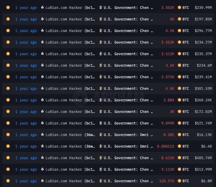 According to Arkham data, an address labeled “LuBian.com Hacker” sent 120,576 BTC — almost its entire holdings — to an address labeled “US Government: Chen Zhi Seized Funds” in a single transaction on July 5, 2024.