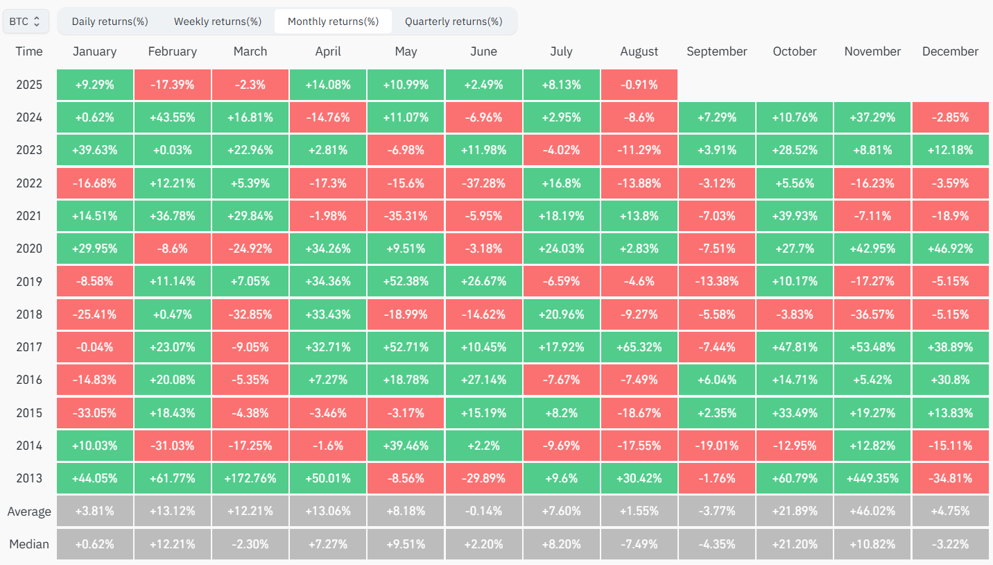 The decline in sentiment comes as Bitcoin (BTC) enters August, historically one of its worst-performing months. Data from CoinGlass shows Bitcoin’s median return in August stands at -7.49%.