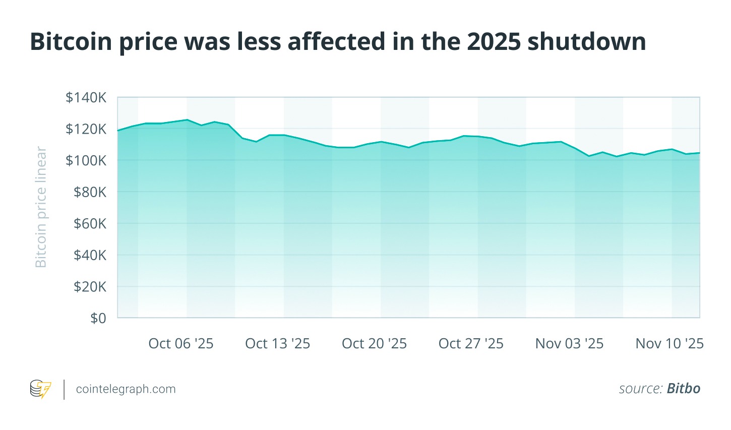 Nearly seven years later, Bitcoin is down over the course of the shutdown, albeit by a smaller margin of 12%. Bitcoin’s price started the shutdown around $120,000 and is currently trading near $105,000.