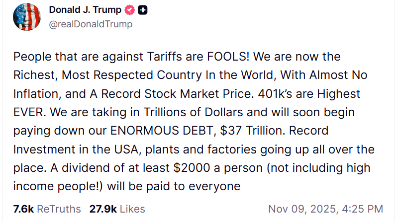 History may not repeat itself, but it rhymes. Citing a massive inflow of revenue from the trade tariffs he began imposing earlier this year, Trump announced that he would be issuing a $2,000 stimulus check to Americans.