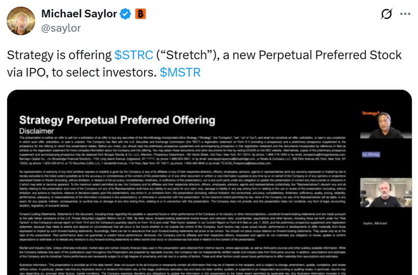 Michael Saylor’s Strategy announced plans to conduct an initial public offering of 5 million shares of Strategy’s Variable Rate Series A Perpetual Stretch Preferred Stock (STRC).