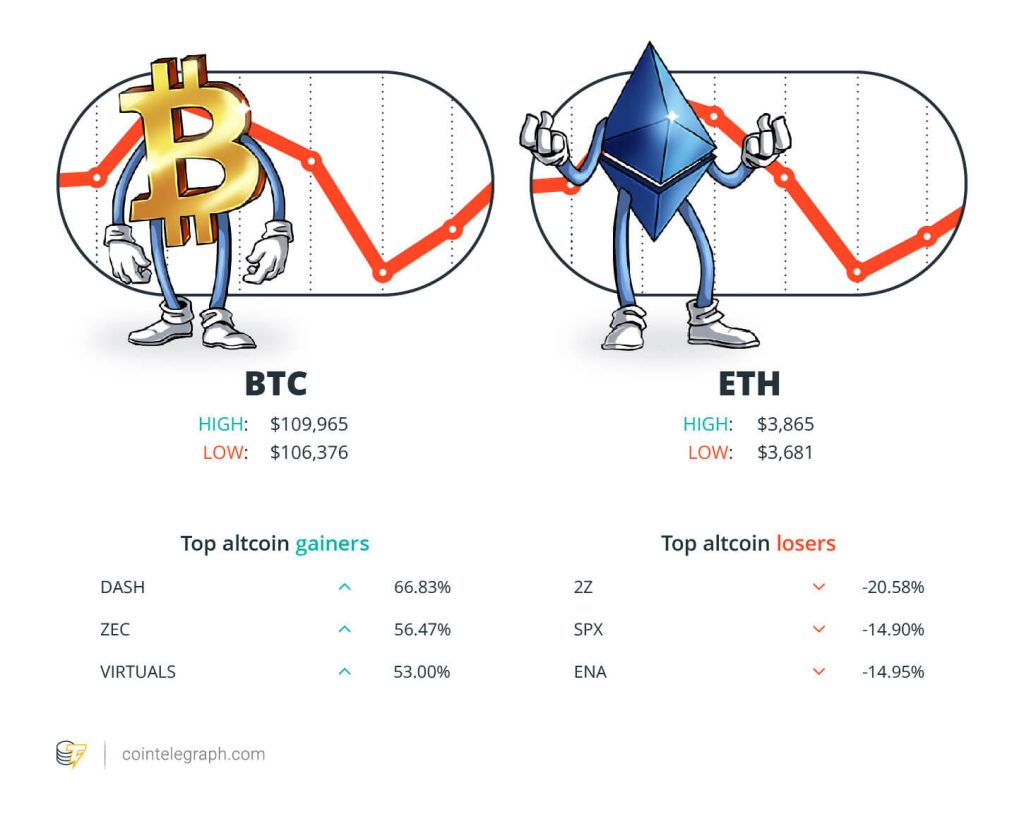 At the end of the week, Bitcoin (BTC) is at $109,965, Ether (ETH) at $3,865 and XRP at $2.50. The total market cap is at $3.71 trillion, according to CoinMarketCap.