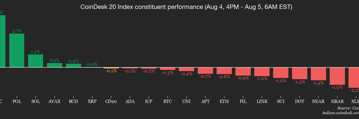 - BTC is unchanged from 4 p.m. ET Monday at $114,615.76 (24hrs: 0.18%)