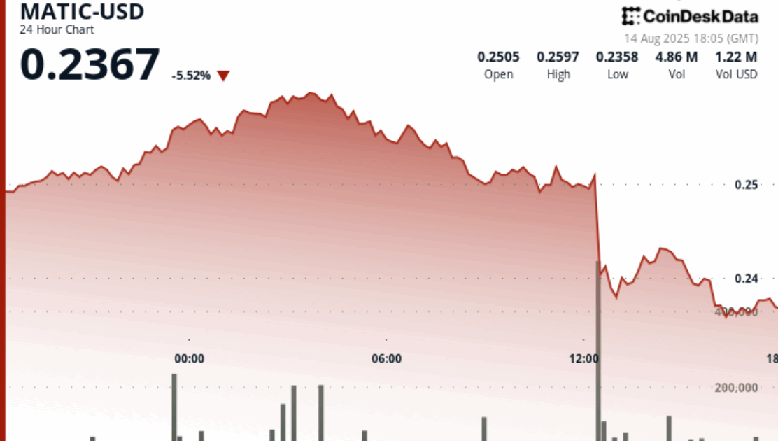 POL traded in a wide 10% range over the past 24 hours, climbing from $0.25 to $0.26 in early trading before reversing sharply, data from CoinDesk Analytics shows.