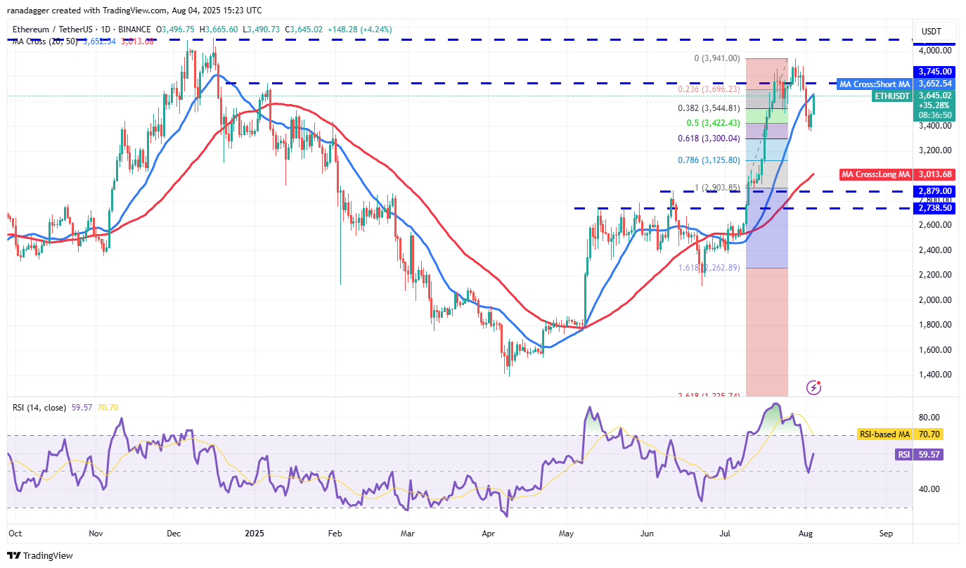 The relief rally is expected to face selling at the 20-day SMA ($3,652), but if the bulls prevail, the ETH/USDT pair could ascend to $3,941 and eventually to $4,094. Sellers are expected to mount a strong defense at $4,094.