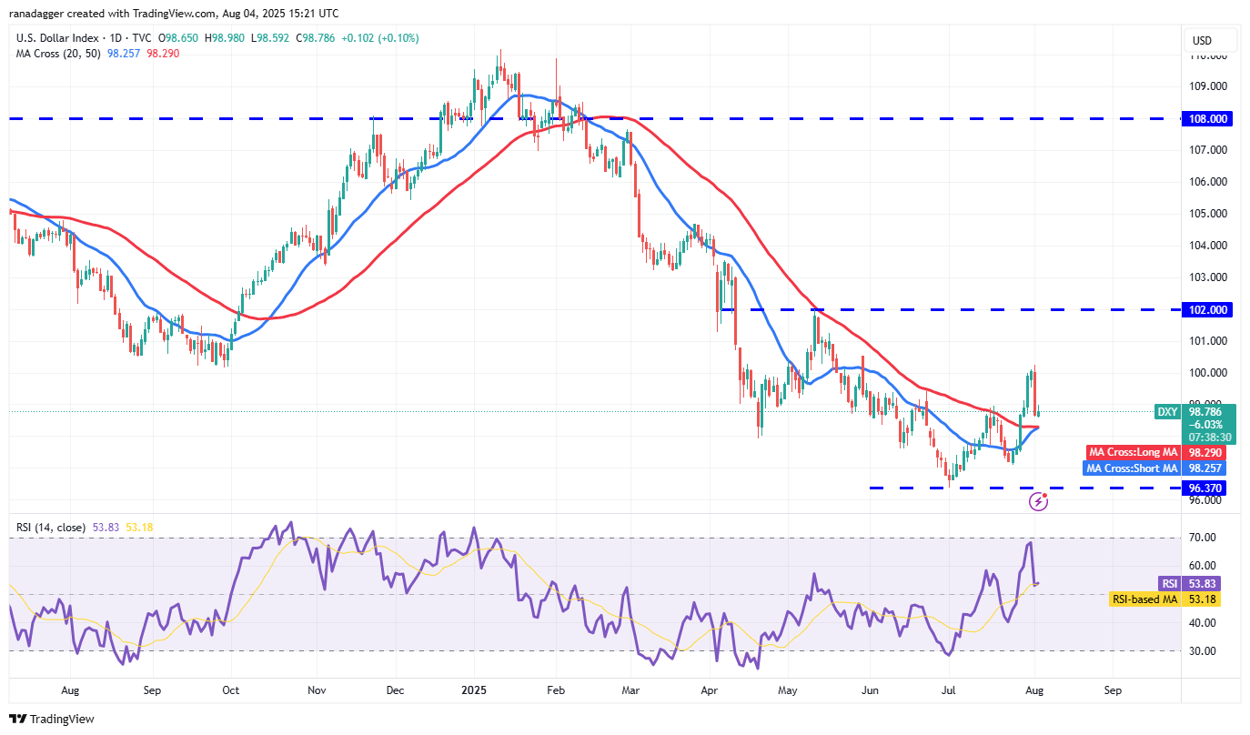 The US Dollar Index (DXY) broke above the 50-day SMA (98.29) on July 28 but turned down from the overhead resistance of 100.54 on Friday.