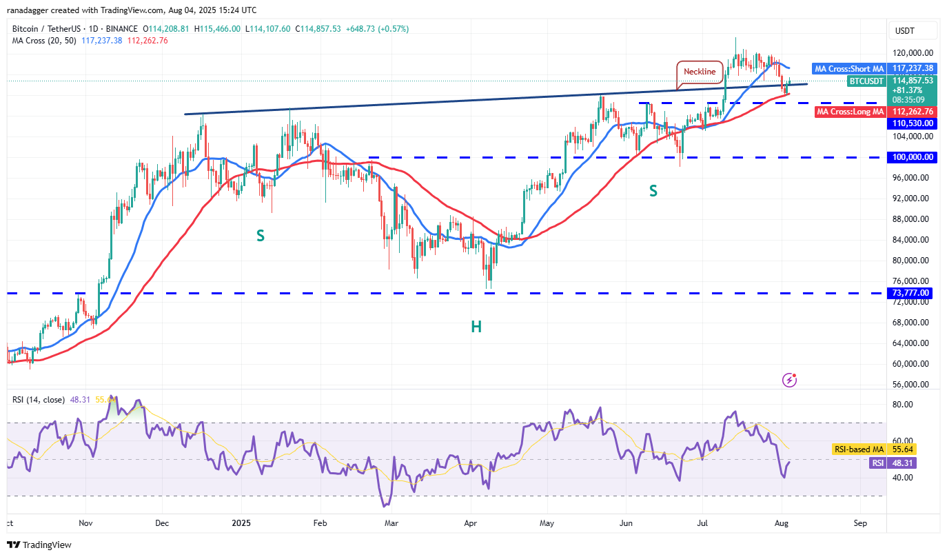 Bitcoin (BTC) bulls are trying to maintain the price above $115,000, but are facing stiff resistance from the bears. Maelstrom Fund chief investment officer Arthur Hayes said in a comment to a post on X that sluggish credit market and slowed job creation could sink BTC to $100,000 and Ether (ETH) to $3,000.