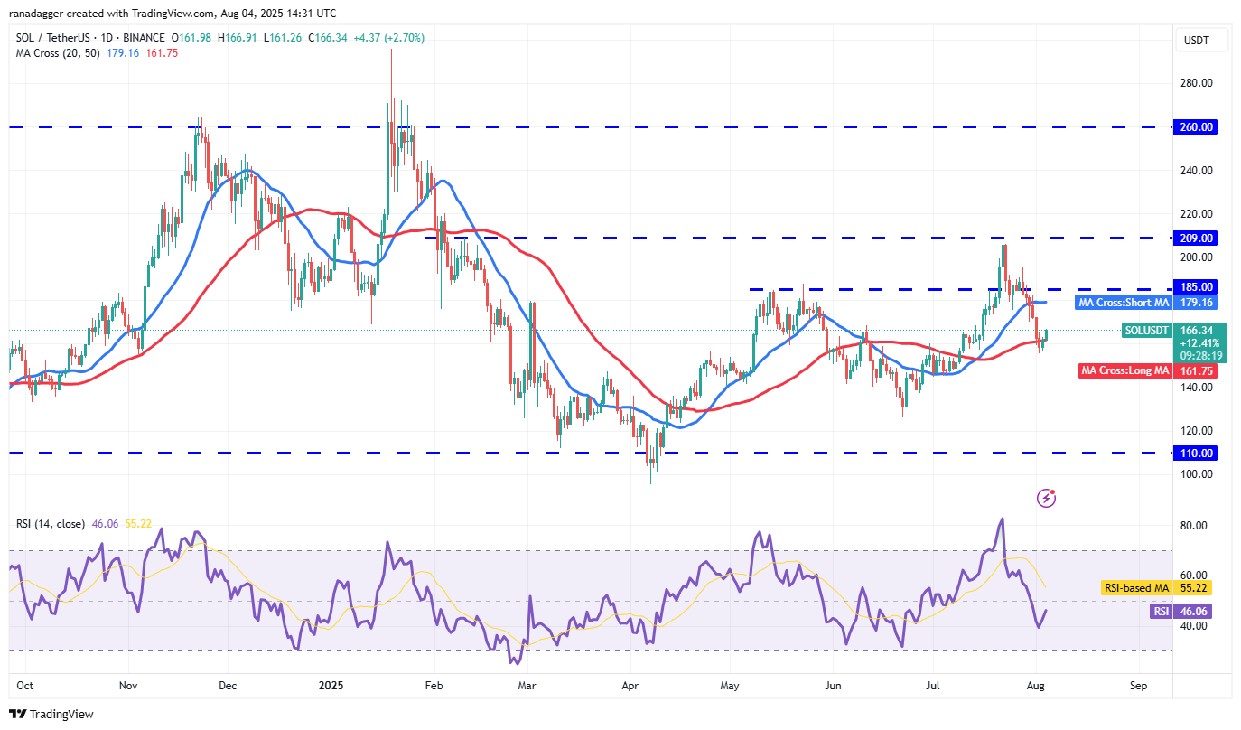 Sellers pulled Solana (SOL) below the 50-day SMA ($161) on Saturday but could not sustain the lower levels.