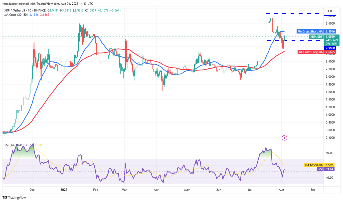The XRP/USDT pair could rise to the 20-day SMA ($3.19), where the bears are expected to step in. If the price turns down from the 20-day SMA, the pair may remain stuck between the moving averages for a few more days.