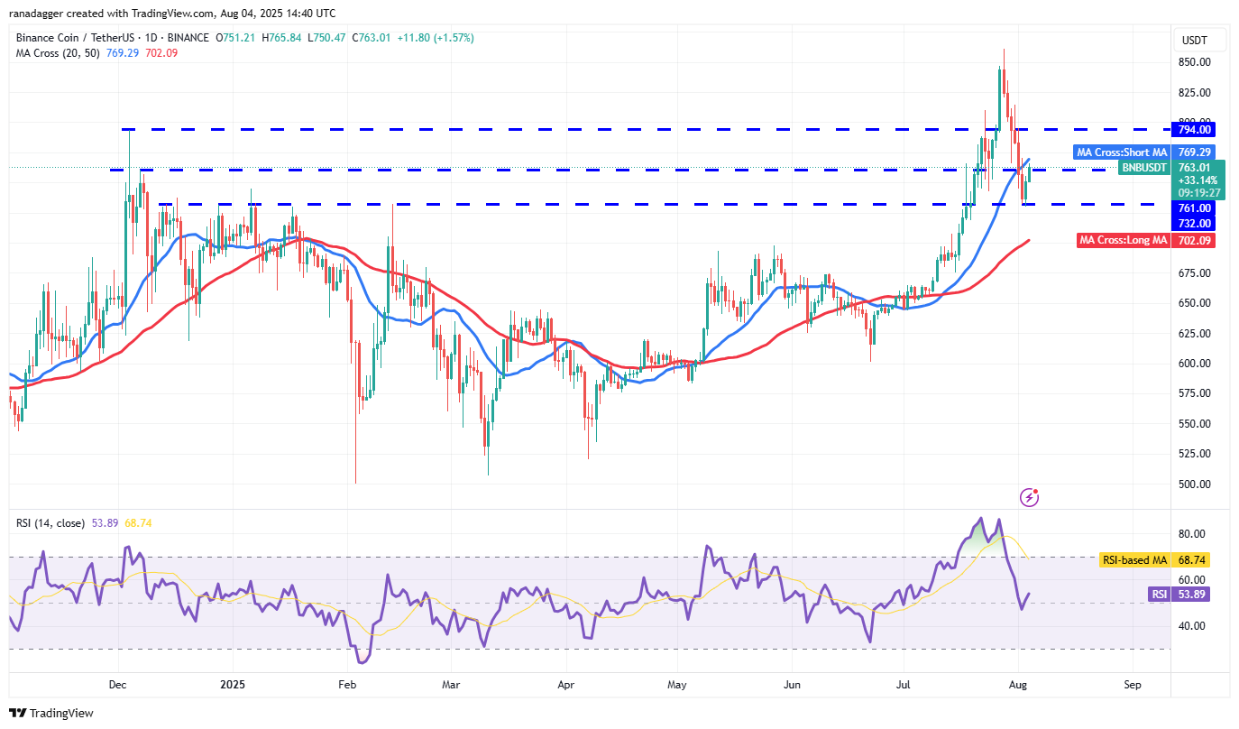 BNB (BNB) plunged below the 20-day SMA ($769) on Friday and reached the solid support of $732 on Saturday.