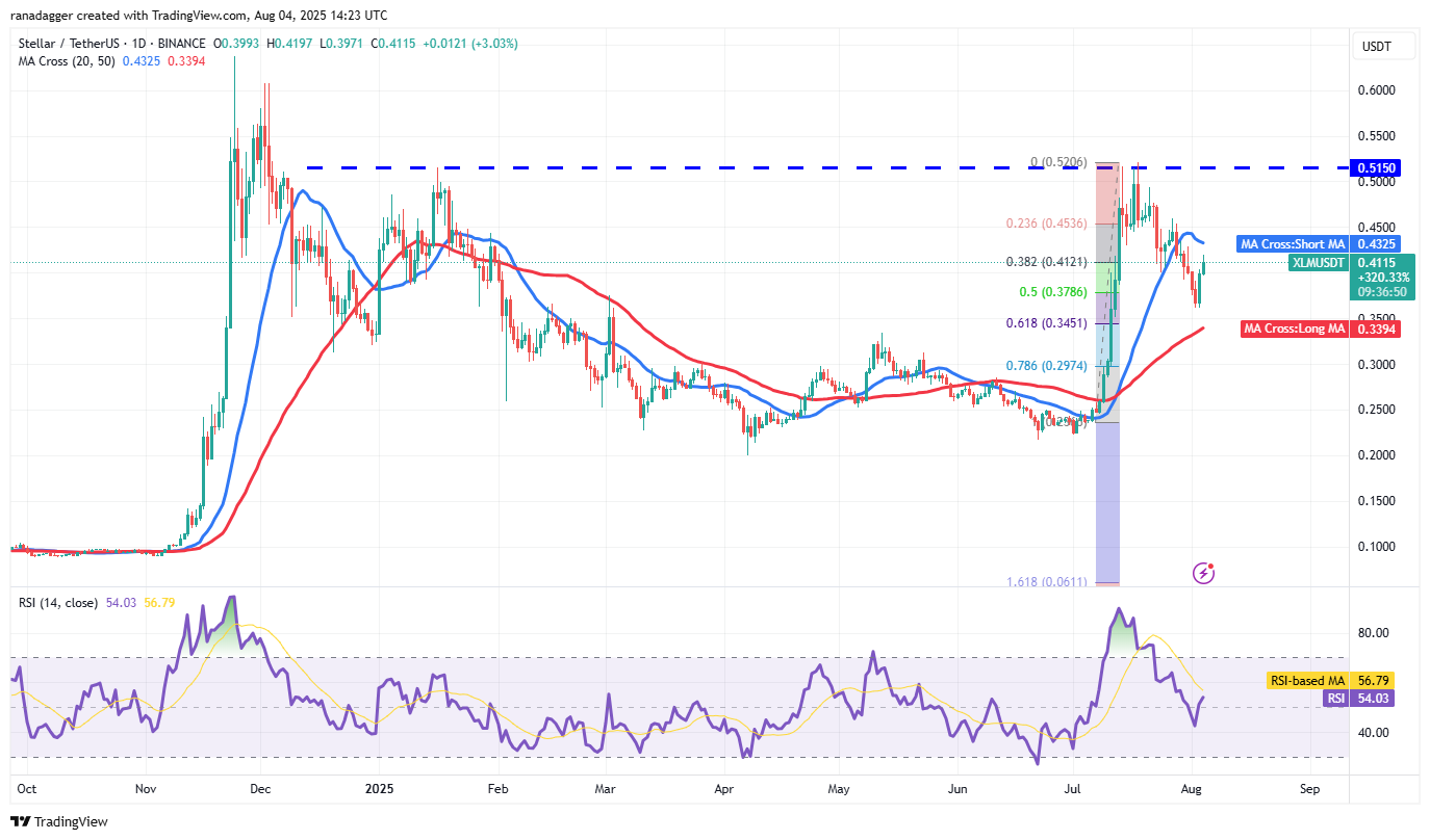 Stellar (XLM) is trying to bounce off the 61.8% Fibonacci retracement level of $0.34, but the relief rally is expected to face selling at the 20-day SMA ($0.43).