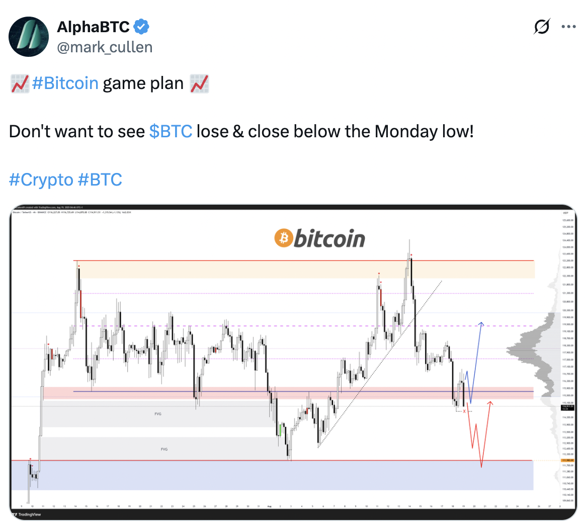 For Bitcoin analyst AlphaBTC, a close below Monday’s low at $114,700 could see the price drop toward the $110,000-$112,000 demand zone.
