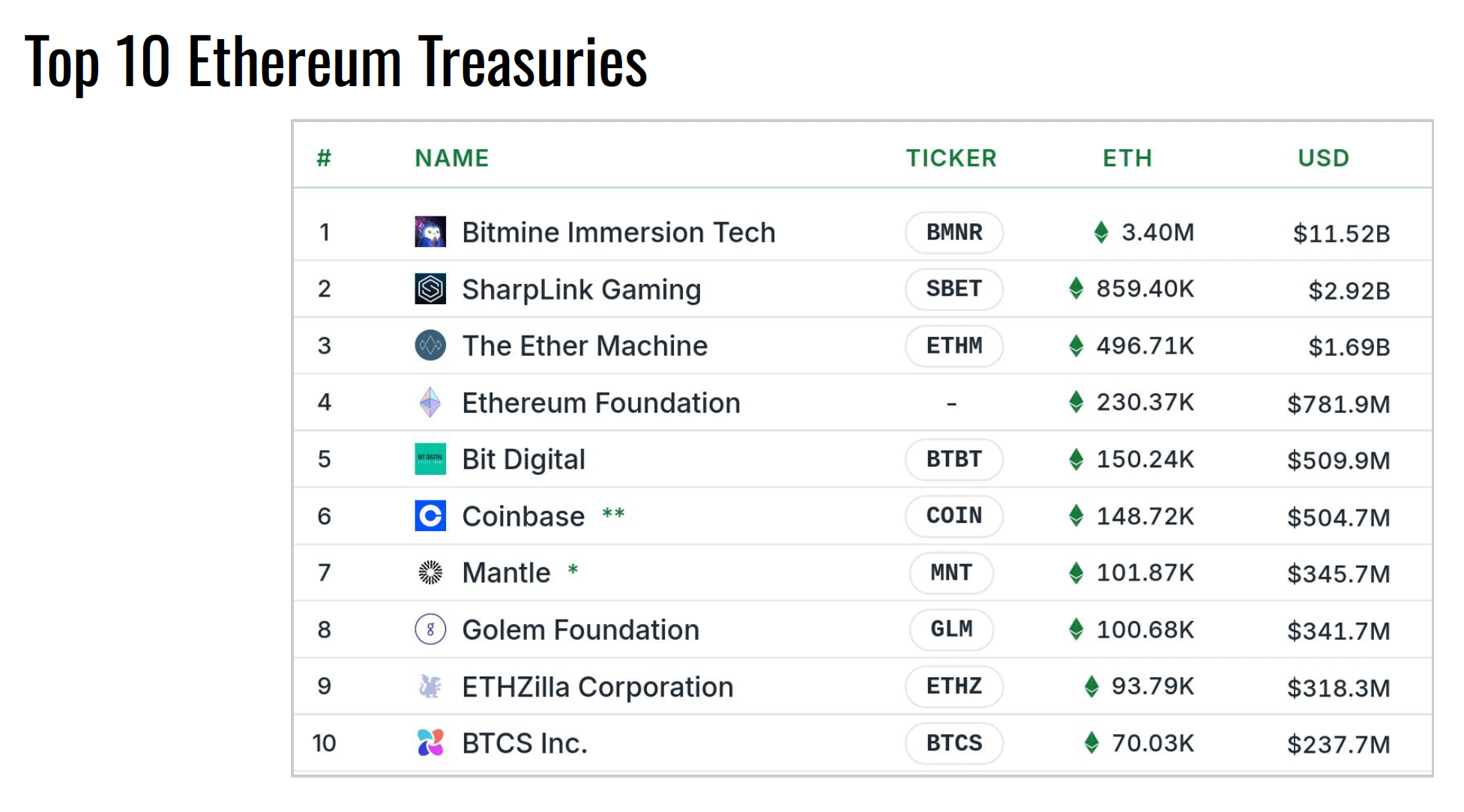The top ETH treasury company is Bitmine, which holds 3,505,723, or nearly 3% of the total Ether supply, according to CoinGecko data.