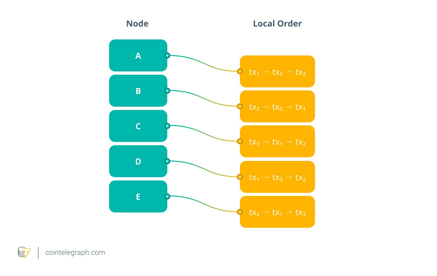 Assume five nodes (A–E) participating in consensus receive three transactions: tx₁, tx₂, and tx₃. Due to network latency, their local orders differ: