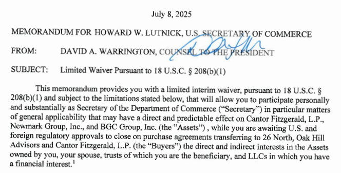 While US law does include certain provisions to protect against conflicts of interest, Lutnick received a waiver on July 8, which allows him to participate “in particular matters … that may have a direct and predictable effect on Cantor Fitzgerald.”