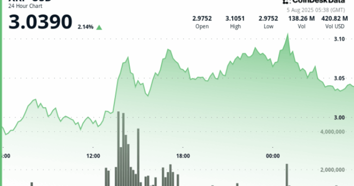 - XRP rallied from $2.92 to $3.05 between 3 August 21:00 and 4 August 20:00, gaining 4.45% with a trading range of $0.18 (6% spread).